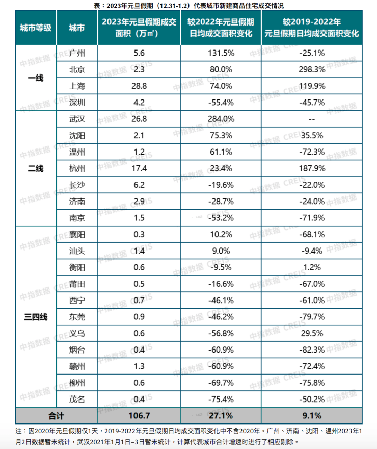 从一线城市情况来看,中指研究院数据显示,上海在第八批项目入市、房企积极促销、集中网签备案综合因素影响下,2023年元旦假期新建商品住宅成交面积较2022年元旦假期上涨74%,成交面积在一线城市中排第一。