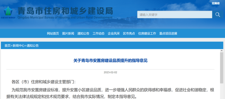 央广网北京2月2日消息 据青岛市住房和城乡建设局网站消息,为规范青岛市安置房建设标准,提升安置小区建设品质,进一步增强人民群众的获得感和幸福感,近日,青岛市住建局发布《关于青岛市安置房建设品质提升的指导意见》(以下简称《指导意见》)。《指导意见》明确,以改善城市面貌与提高安置居民生活质量有机结合为目标,努力实现从“住有所居”向“住有宜居”迈进。