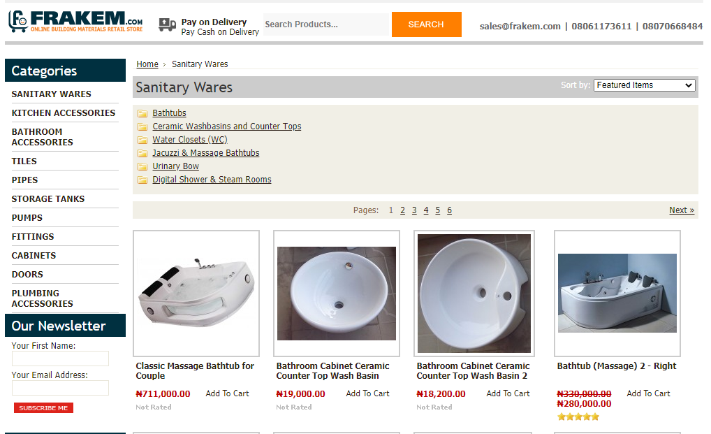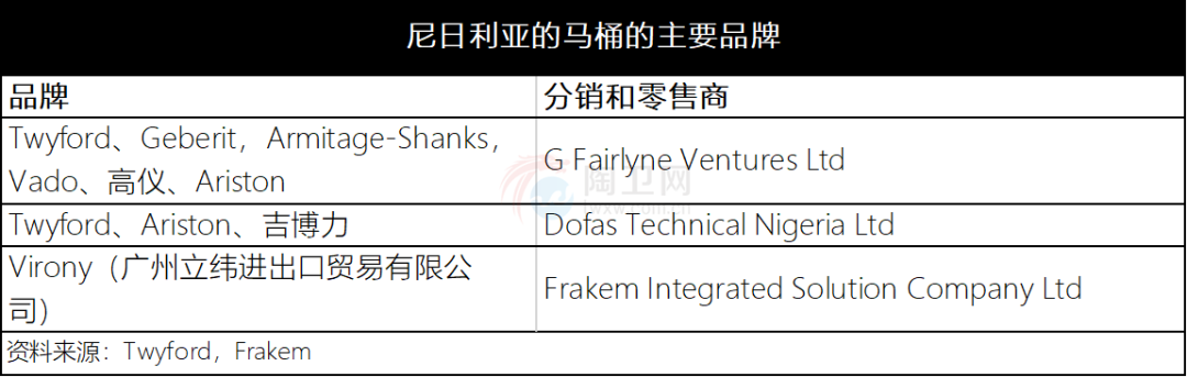 尼日利亚的授权分销商在尼日利亚代理的一些全球品牌包括:Twyford,G-fairlyne,意中陶Imex,Vado,Geberit,Paris,Radof、Ideal Standard U.K、Imperial等。如据称为尼日利亚排名排名前列的在线家居购物商城看来,洗脸盆主要以圆形等传统款式为主,面盆龙头主要以老款的龙头为主,也有按摩浴缸、蒸汽房等