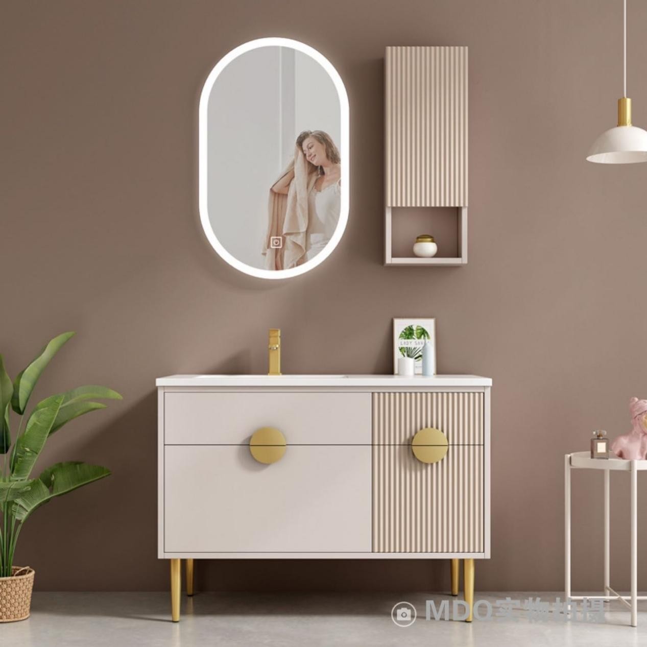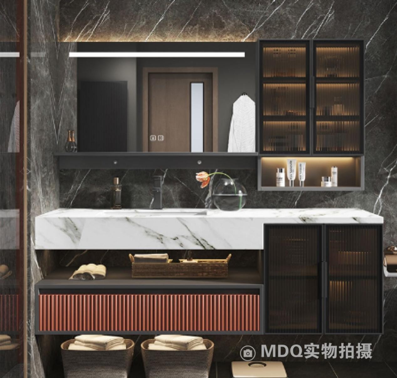 ②可以伸手摸摸板面。像市场口碑不错的德国MDQ卫浴岩板浴室柜的哑面就有岩石的质感,粗而不糙,而且板面有温度。如果是摸下去感觉冰凉的产品,就要小心购买了。