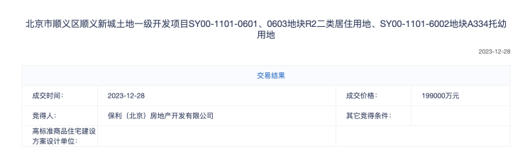 根据成交结果,该地块由保利(北京)房地产开发有限公司以底价19.9亿元摘得,成交楼面地价18524元/平方米。