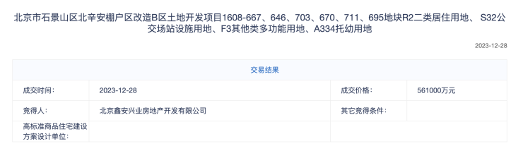 根据成交结果,该地块由中海地块旗下北京鑫安兴业房地产开发有限公司以底价56.1亿元摘得,折合成交楼面地价16681元/平方米。