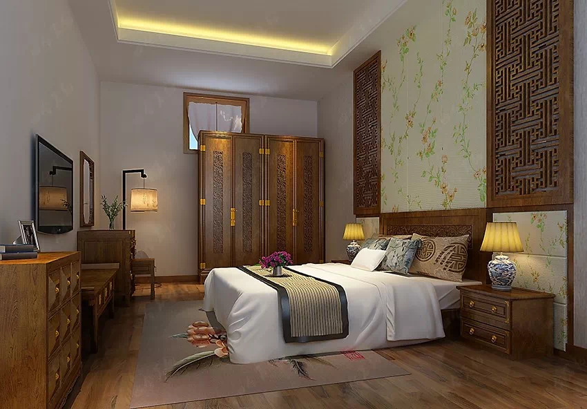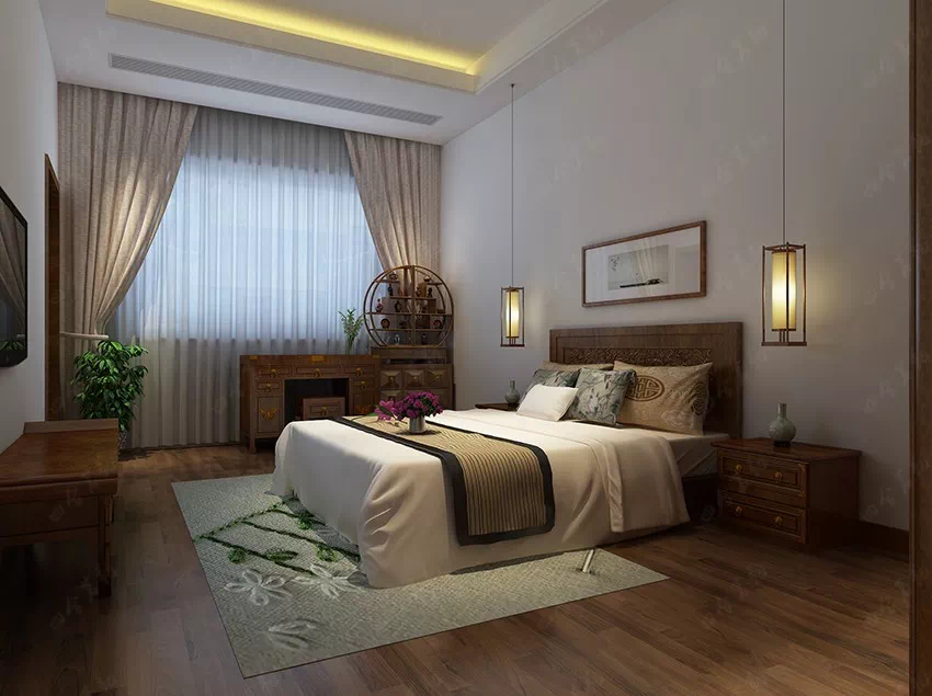 卧室是人们在疲累了一天后歇息的处所,重在干净整洁和清静。设计师除了必要的陈设外并不增加冗余的安排。中式的木质家具,床头一幅清新自然的墙纸,将房间的自然风勾画出轮廓,暖黄柔和的光线使空间氛围显得温馨宜人。简单清爽,是卧室主调,辅以中式家具所呈现的东方文化气息,清新之余不乏文化气息。