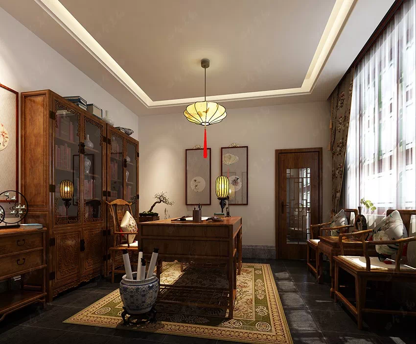 中式家居因其质感与色彩,加上朴拙的造型,容易给人一种成熟持重的印象。书房本是清静之地,搭配上中式家具感觉恰如其分。