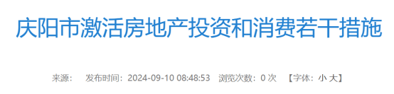9月10日,庆阳住建局发布《庆阳市激活房地产投资和消费若干措施》。