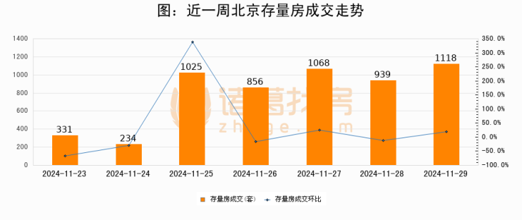 从存量房来看,2024年11月29日北京存量房单日成交1118套,比昨日增加179套,环比上涨19.1%。从近一周存量房成交来看,北京存量房日均成交套数为795套,11月29日单日成交1118套,高于近一周平均水平40.6%。
