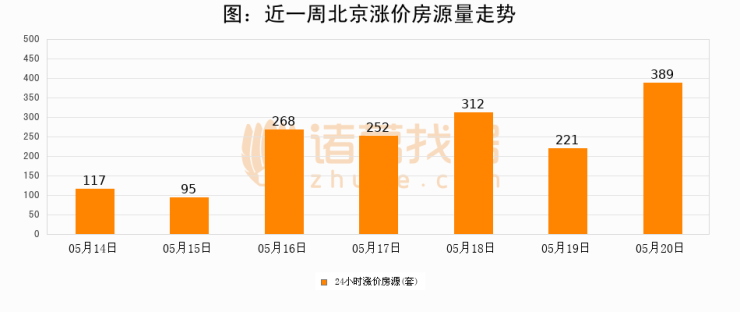 根据诸葛找房数据显示,北京24小时涨价房源量为389套,较05月19日增加168套,环比上涨76%。与此同时,涨价房源占比小幅扩大,业主信心有所提升。