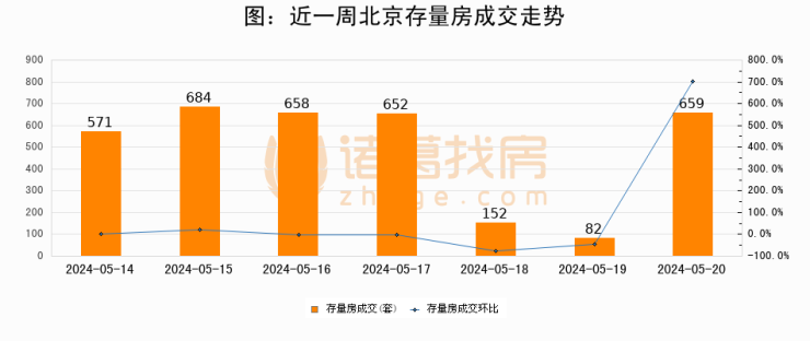 从存量房来看,2024年05月20日北京存量房单日成交659套,比昨日增加577套,环比上涨703.7%。从近一周存量房成交来看,北京存量房日均成交套数为494套,05月20日单日成交659套,高于近一周平均水平33.4%。