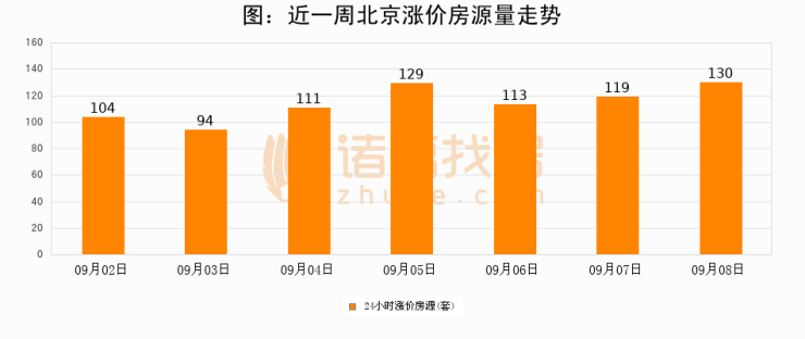 根据诸葛找房数据显示,北京24小时涨价房源量为130套,较09月07日增加11套,环比上涨9.2%。与此同时,涨价房源占比小幅扩大,业主信心有所提升。