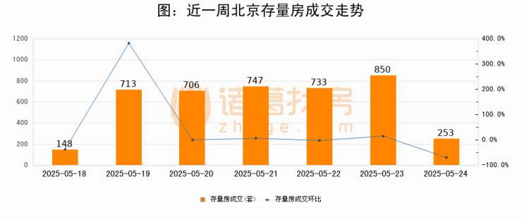 从存量房来看,2025年05月24日北京存量房单日成交253套,比昨日减少597套,环比下降70.2%。从近一周存量房成交来看,北京存量房日均成交套数为592套,05月24日单日成交253套,低于近一周平均水平57.3%。
