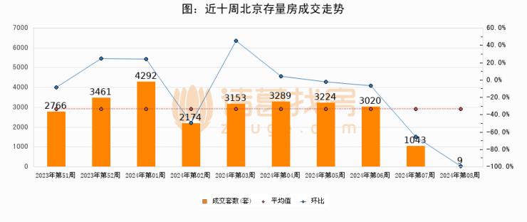 存量房方面,第07周北京存量房成交9套,较上周减少1034套,环比下降99.1%。从近十周成交走势来看,周均成交套数为2643套,本周低于平均水平99.7%。