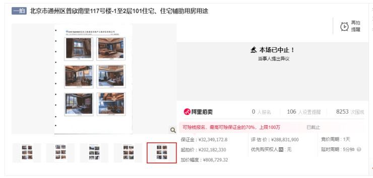 上游新闻记者获悉,天津市第二中级人民法院原定于2022年2月25日至26日,在阿里司法拍卖网络平台上,对北京市通州区普欣南里117号楼-1至2层101住宅、住宅辅助用房,进行公开拍卖,起拍价为2.0218233亿元。拍卖为泰禾集团(000732)旗下北京泰禾房地产开发有限公司无力偿债,而被债权人申请法院强制执行。 但在拍卖前,宣告中止,原因为当事人提出异议。