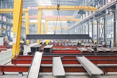 1月14日,山西省运城市经济技术开发区的华兆东南(运城)绿色建筑集成有限公司内,工人忙着生产加工陕西咸阳机场三期扩建工程钢构件订单。