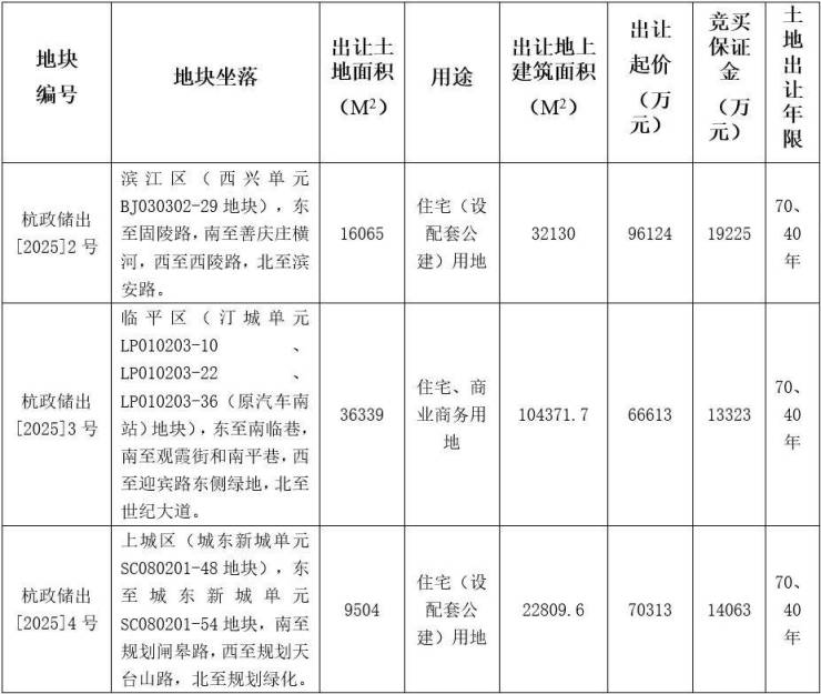 1月10日,浙江省杭州市规划和自然资源局发布3宗涉宅地块使用权挂牌出让公告。3宗宅地分别位于上城区、临平区和滨江区,土地面积61908平方米,建筑面积159311.3平方米,起始总价23.305亿元;截止报价时间为2月20日,本次挂牌出让宗地实行自由竞价,按照价高者得的原则确定竞得人。