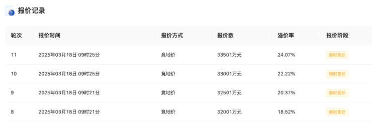 竞价记录显示,该地块经过11轮竞价后,由杭州星耀房地产开发集团有限公司旗下杭州星凝置业有限公司以总价33501万元竞得,成交楼面价20472元/平方米,溢价率24.07%。