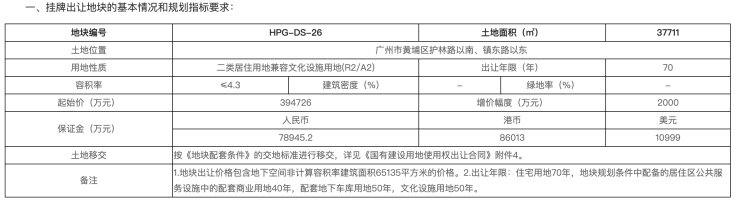 广州黄埔挂牌一宗涉宅地块未设地价上限,后续地块以出让要求为准