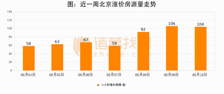 根据诸葛找房数据显示,北京24小时涨价房源量为104套,较08月09日减少2套,环比下降1.9%。与此同时,涨价房源占比小幅回落,对于购房者来说是一个入市窗口期,购房者可抓住时机入市。