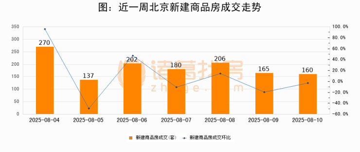 根据北京市住房和城乡建设委员会数据显示,2025年08月10日北京新建商品房成交160套,较昨日减少5套,环比下降3%。近一周北京新建商品房日均成交189套。08月10日单日成交160套,低于近一周平均水平15.3%。