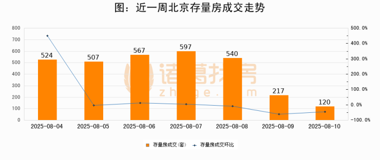 从存量房来看,2025年08月10日北京存量房单日成交120套,比昨日减少97套,环比下降44.7%。从近一周存量房成交来看,北京存量房日均成交套数为438套,08月10日单日成交120套,低于近一周平均水平72.6%。
