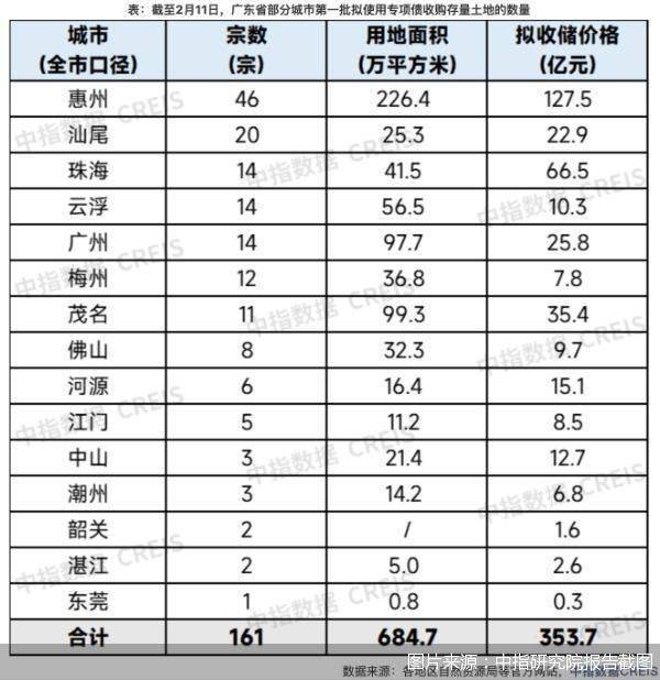 2月13日,中指研究院发布数据显示,截至2月11日,广东省佛山、惠州、珠海、中山、江门等15个地区公告涉及土地共计161宗,总面积达684.7万平方米,拟定的收储价格总额合计为353.7亿元。