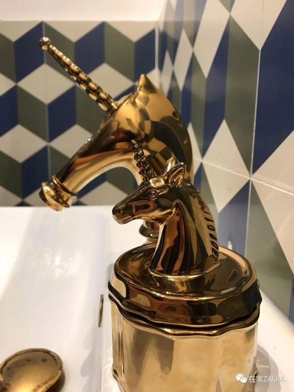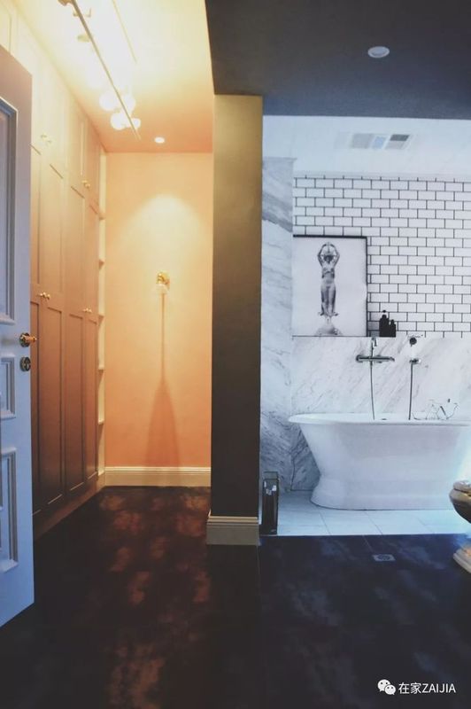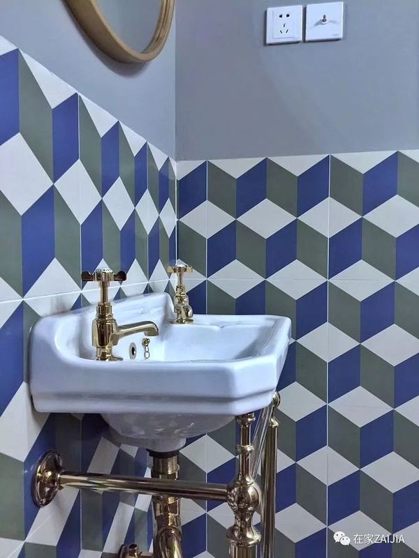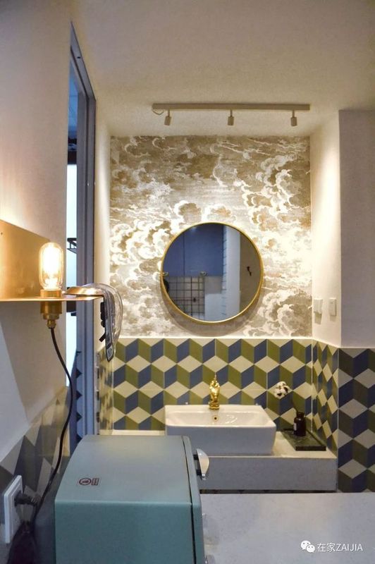 空间色彩搭配:干区为复古瓷砖拼乌云墙纸;湿区则是黑色瓷砖拼花砖。