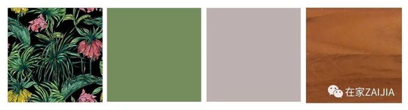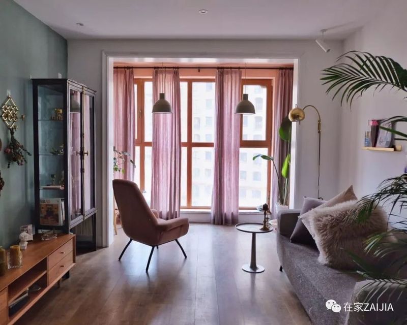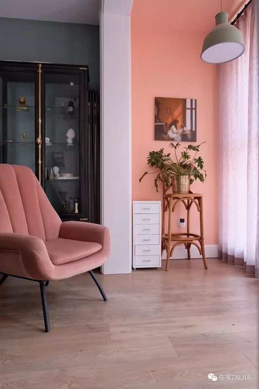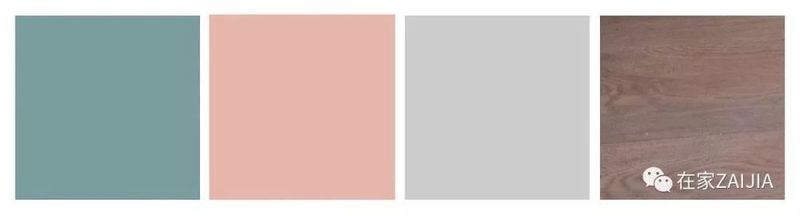 墙面色彩搭配:灰粉+灰绿,搭配深色木纹地板,记得适当留白。
