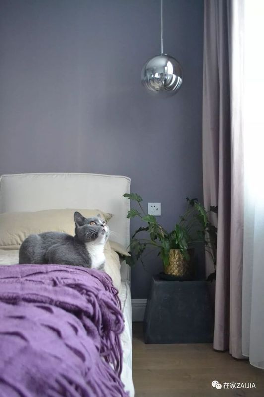 空间色彩搭配:为了做出静谧的风格,整个空间只用了灰、紫两种色彩进行搭配,而在五金上则选择了跟冷色调更搭的银色,让整个空间视觉上更统一。