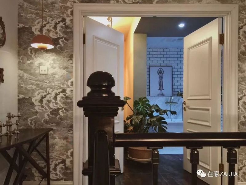 顺着楼梯上来可以看到一个双开门,里面便是衣帽间与卫浴间。这里以前是两个空间,为了满足自己能有个双开门的小梦想,装修时就把墙拆了一半,做了一扇双开门,将衣帽间和卫生间合成了一个空间。