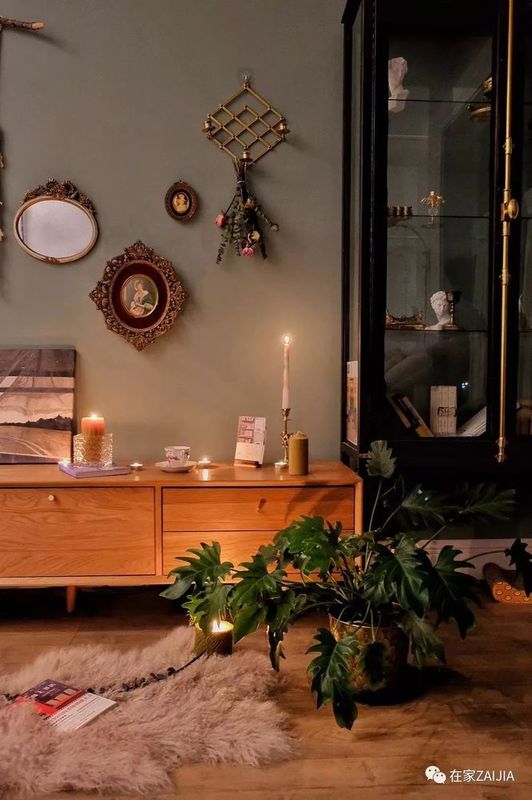 绿色空间搭配中古饰品和孟菲斯风格的台灯,很有意思。