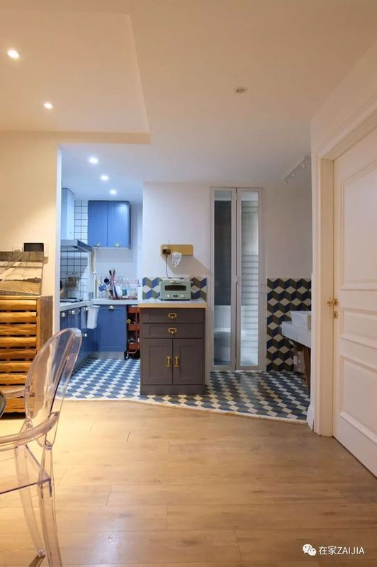 厨房区看向一层卫浴间的干区。将干区的墙砖延伸到厨房地砖,让两个空间保持呼应关系。但个人并不建议这样的铺法,使用过程中会发现这个花砖铺地其实挺不耐磨的。