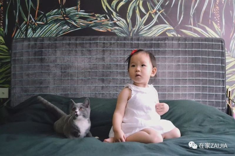 朋友家的宝宝来家里,跟鼓球在主卧的床上玩耍。