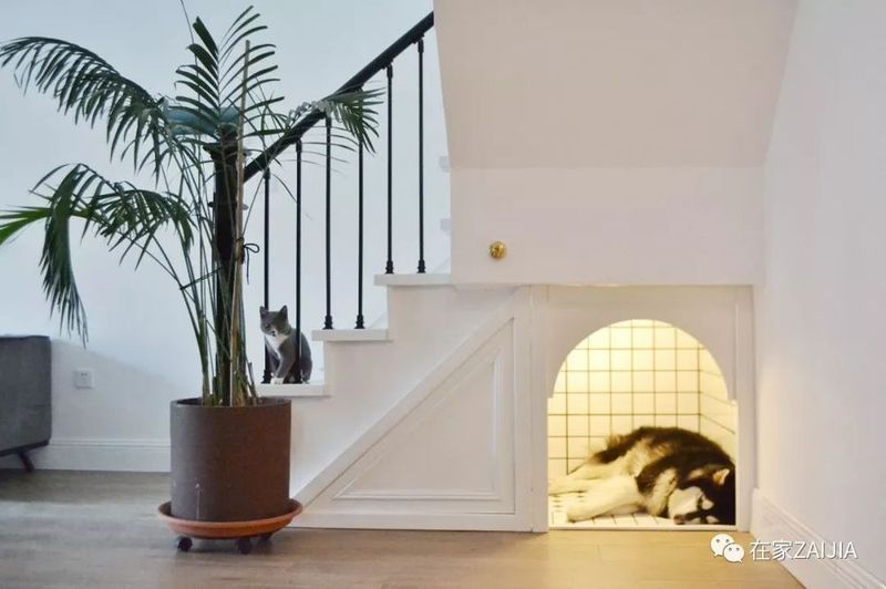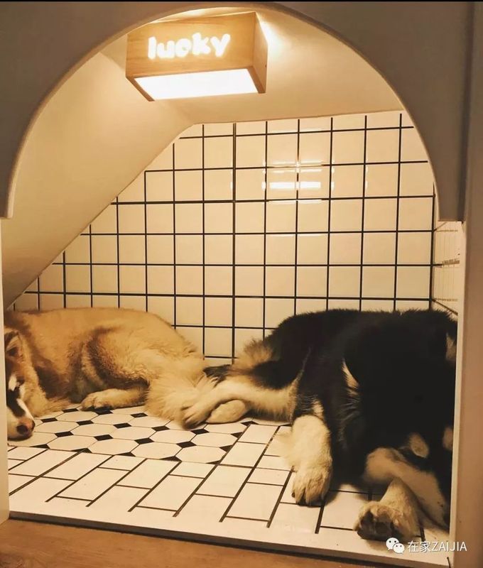 如果家里的宠物是极地犬种,注意狗窝内一定不要铺地热,建议里面贴瓷砖,为了方便打理。我们家贴的都是卫浴间和厨房剩下的边角料,凑一凑就变成了这样一个混搭风的小窝。