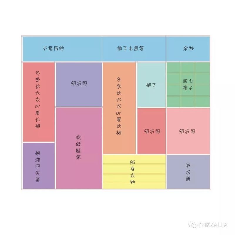 对于衣柜的定制,我的原则是一定要通顶,虽然上面一层会很少用到,但用来放过季的被褥也比接灰强,下面是衣柜功能区的划分图。