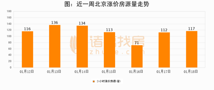 根据诸葛找房数据显示,北京24小时涨价房源量为117套,较01月17日增加5套,环比上涨4.5%。与此同时,涨价房源占比小幅扩大,业主信心有所提升。