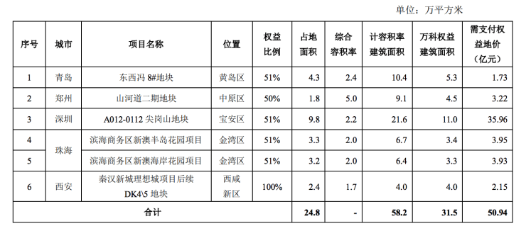 新增开发项目方面,6月份,万科新增加开发项目6个,与5月份持平。6个项目分别位于青岛、郑州、深圳、珠海和西安。项目占地面积24.8万平方米,计容积率建筑面积58.2万平方米,万科权益建筑面积31.5万平方米,支付权益地价50.94亿元。