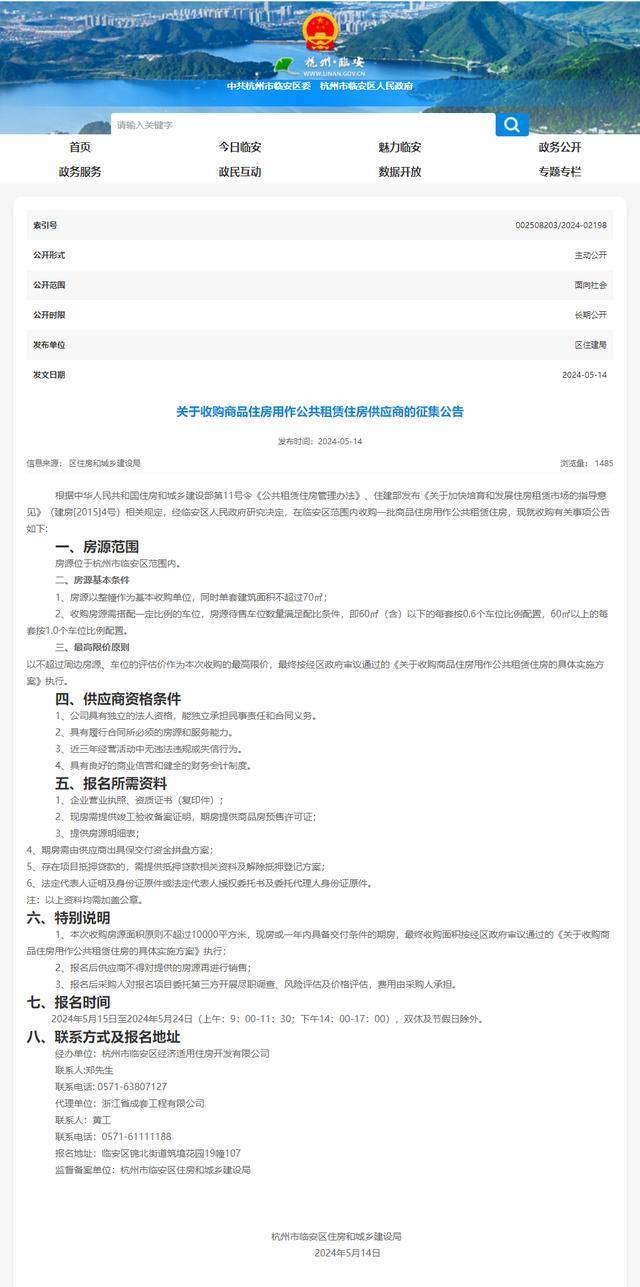 据杭州市临安区政府网站消息,杭州市临安区住房和城乡建设局发布《关于收购商品住房用作公共租赁住房供应商的征集公告》(简称公告)。