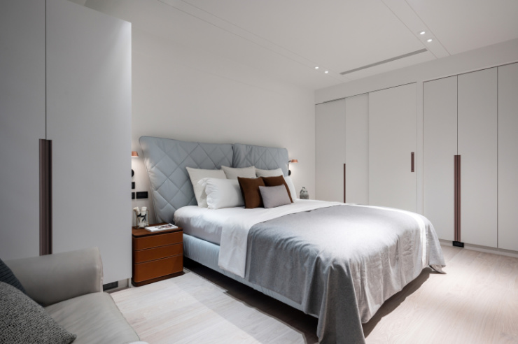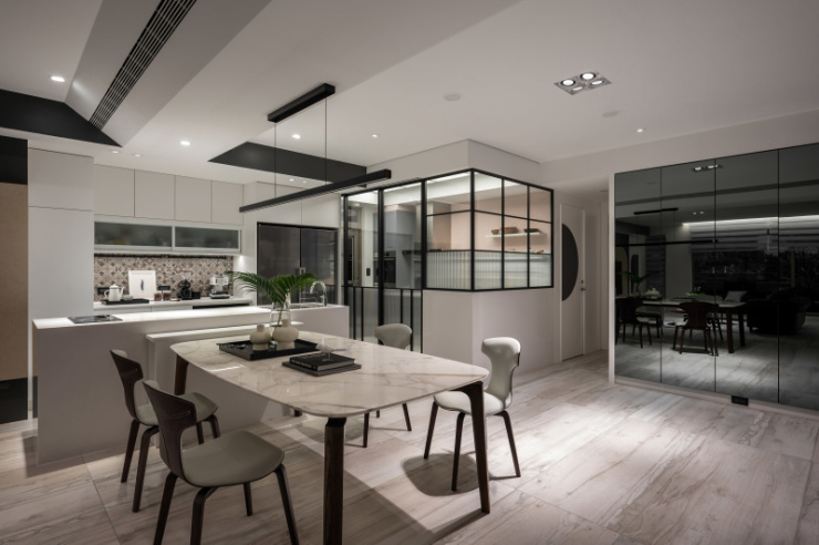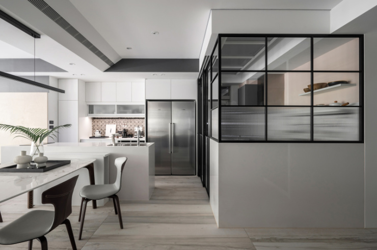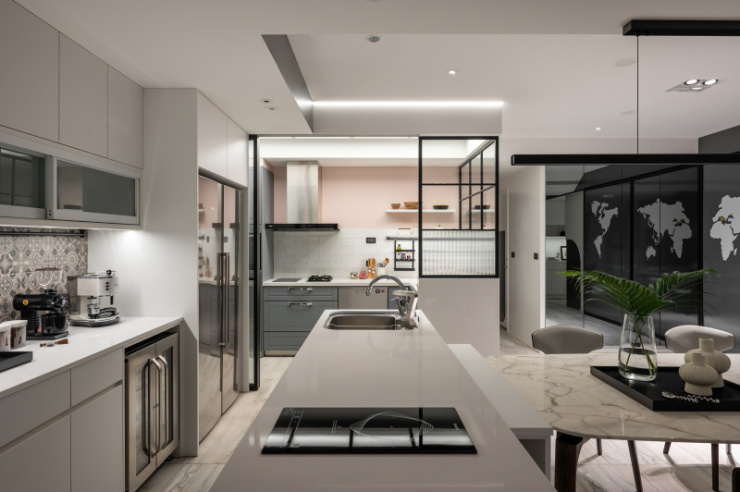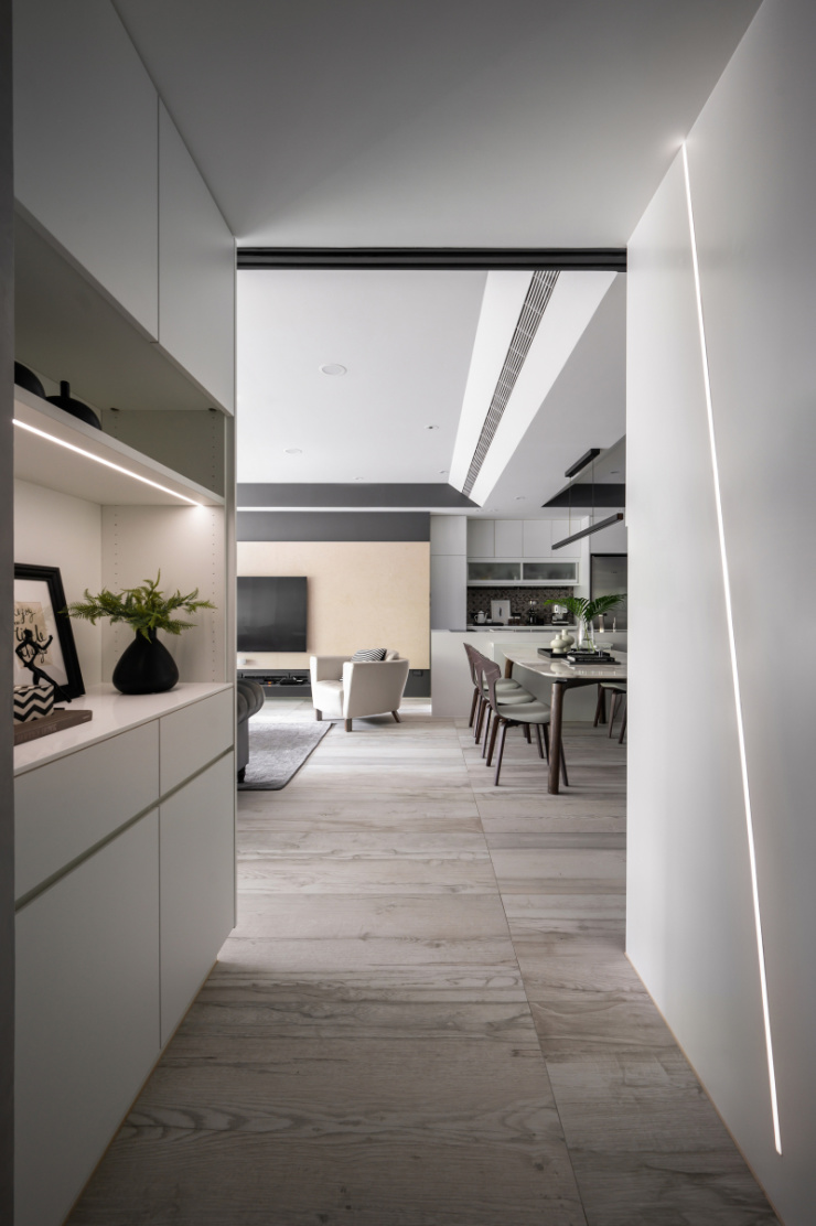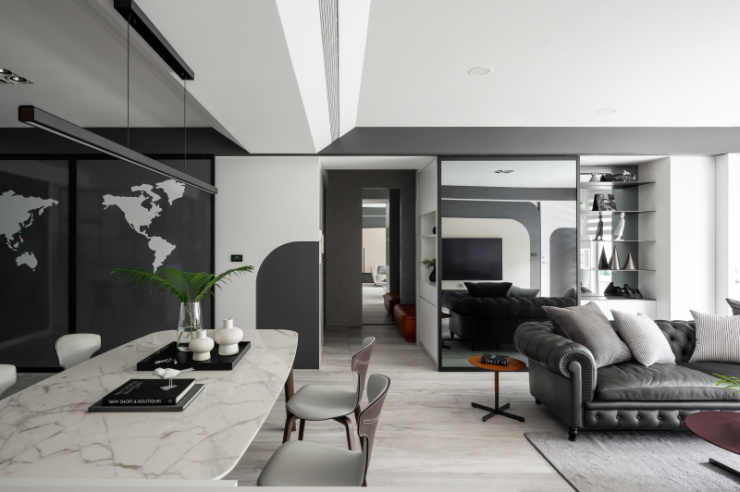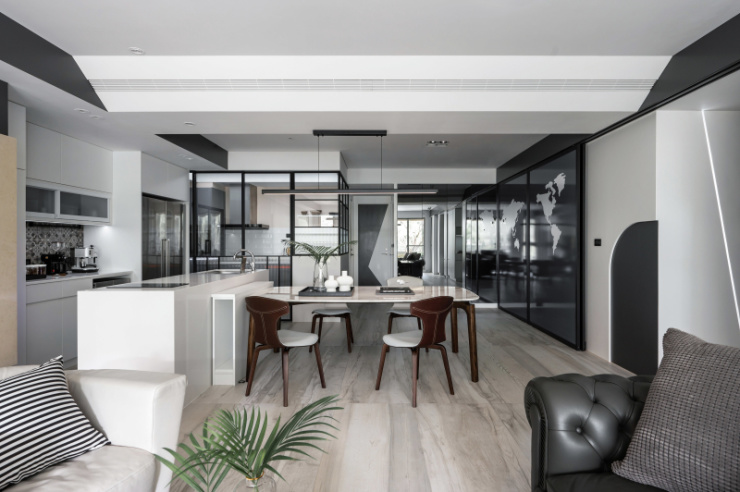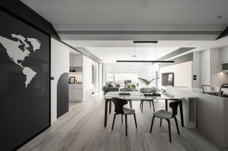 白手起家的屋主,如今在业界已是成功人士代表,设计者以显现屋主社经地位、符合全家日常习惯为蓝图,打造出舒适的居家环境。尤其因全家人喜爱旅行的缘故,餐厅区特别加了一面具地图展示功能拉门,做为全家人出国旅游回家后可记录下来的方式。