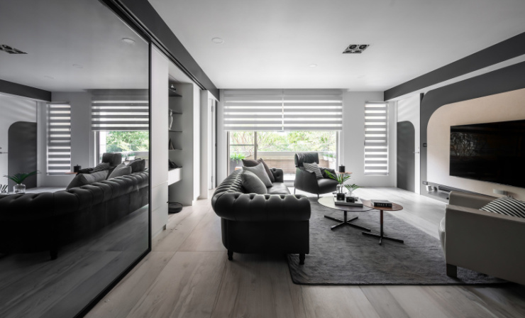 在这处优雅低彩度的空间中,设计者以雷射雕刻金属板、大理石牆面、进口地砖等材质语彙,打造出兼具现代感与温暖的居家环境。公领域开放式的设计与大面积的落地窗,在视觉上的放大了空间尺度,也营造更自然舒适的居家氛围;特殊弧线型的电视牆面与沙发座椅两相呼应、大面积的木纹砖选择,为简约的居家风格营造更温暖的气息!