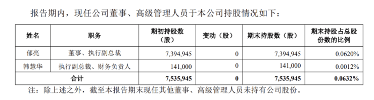 根据万科2025年半年度报告,现任董事、执行副总裁郁亮持股7,394,945股,占总股份数比例为0.0620%;执行副总裁、财务负责人韩慧华持股141,000股,占总股份数比例为0.0012%。
