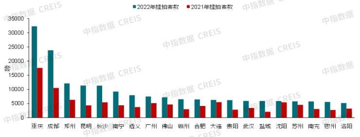 2021年、2022年挂拍量TOP20城市挂拍套数变化情况