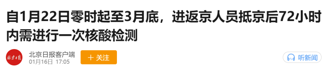 如果您需要考虑离京过年,房叔提醒您1月22日之后进京不仅需要持48小时内核酸阴性报告,还需要在抵京72小时之内再测核酸。