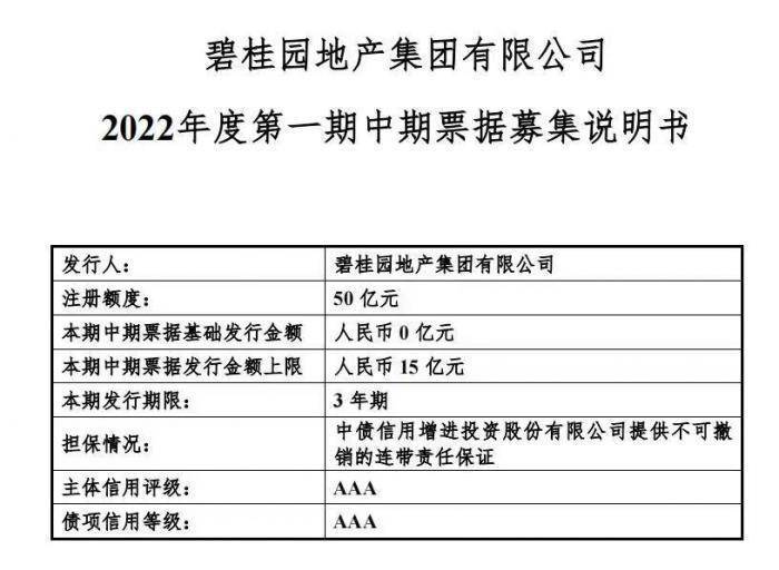 回看此次中票,公开资料显示,碧桂园地产此前已于2022年2月25日完成中期票据注册,本金金额为50亿元。此次排名前列期发行金额15亿元,期限3年。