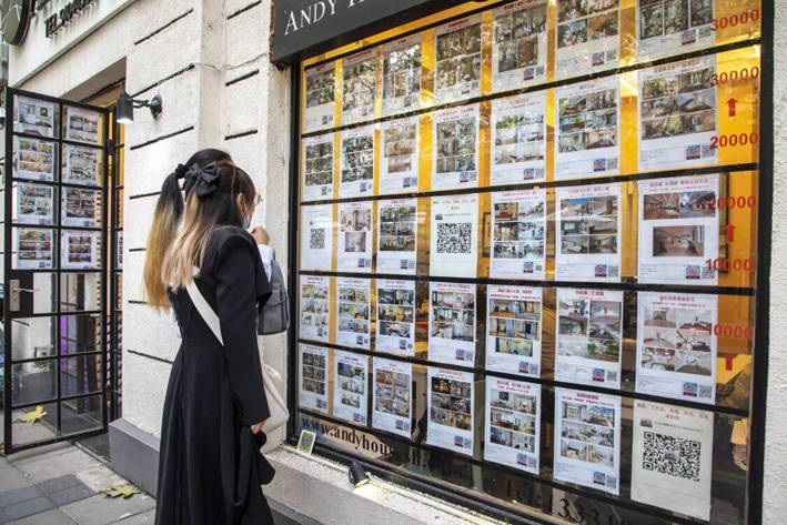 上海,市民在一家房产中介公司橱窗前研究二手房价格 IC photo