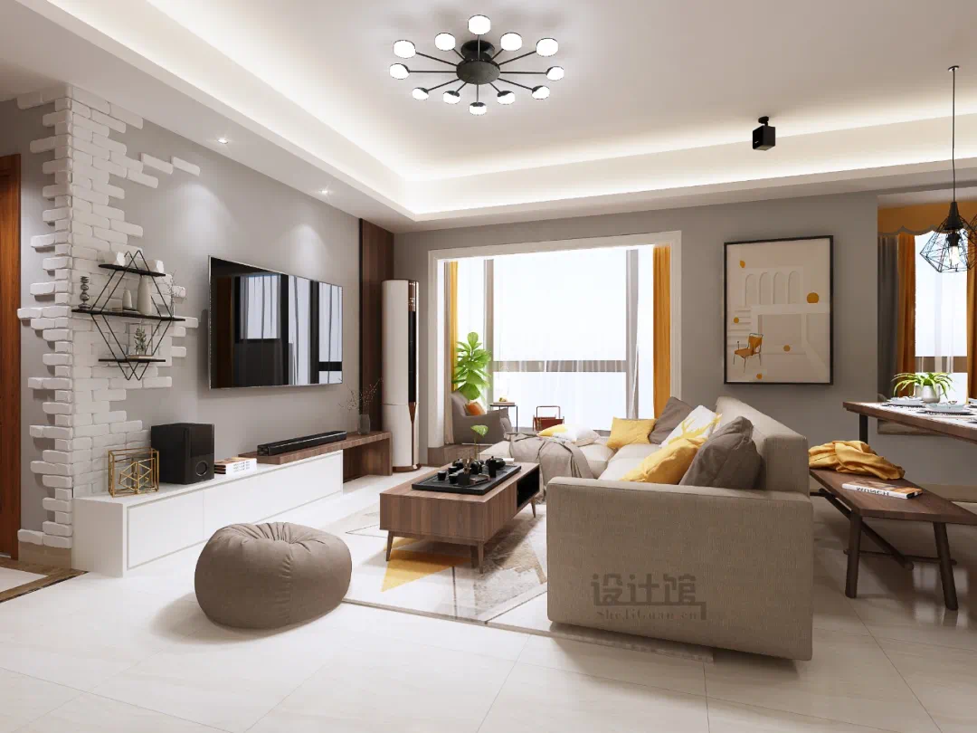 如果觉得横厅格局下,沙发不靠墙布置感觉不踏实的话,可以在沙发墙位置砌个矮墙,这样既能保持横厅户型的宽敞视觉与采光,又能让客厅空间相对独立起来,让沙发摆放也有依靠的位置,舒适而有轻松惬意。