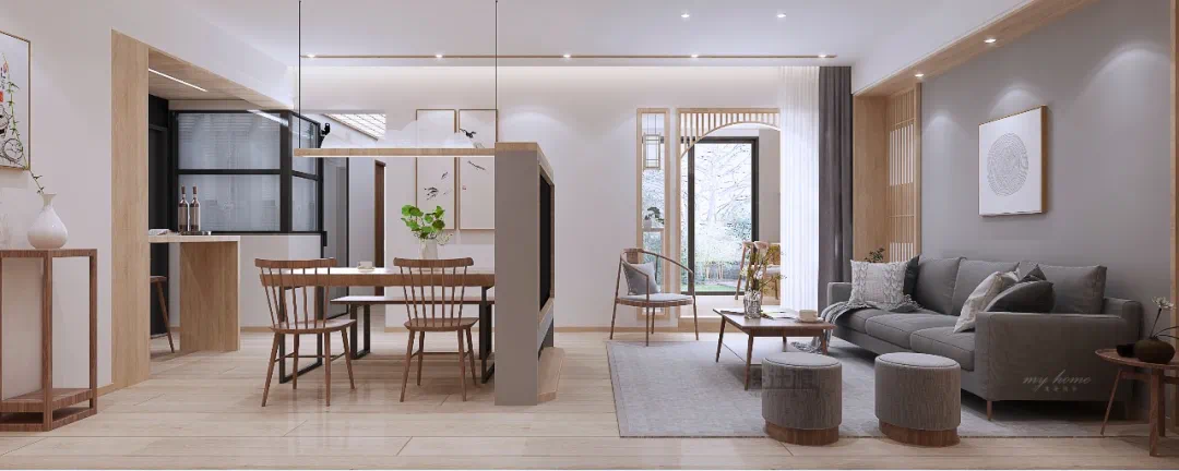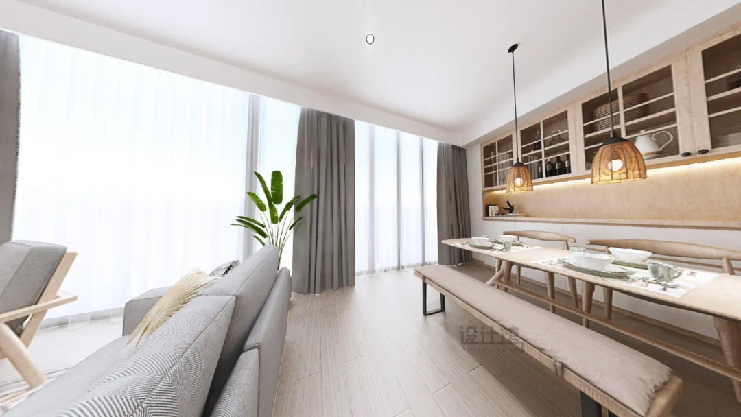 如果横厅相对宽敞,在常规布置客厅、餐厅的基本功能后,中间还有宽裕的空间,也可以在沙发与餐桌椅之间留出过道空间,这样在客厅活动的时候,就可以有更加轻松舒适的生活动线,家有小孩的话,整个客厅就像是一个环形的小跑道,可以尽情地玩耍。