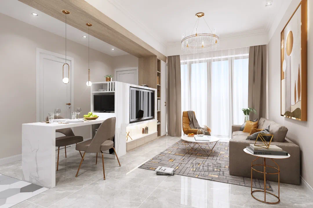对于户型比较小的横厅,可以把矮墙沙发墙与餐桌椅连成一体布置,让小户型也有宽敞舒适的空间感。