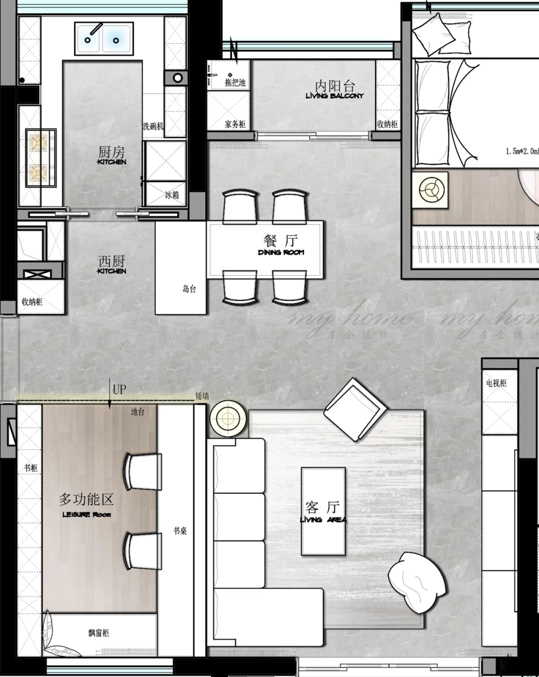 沙发后方的横厅,布置成多功能的休闲与办公区,让生活体验更加丰富有趣。