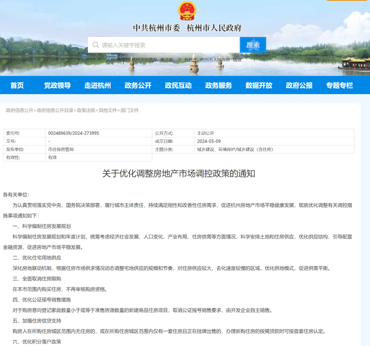 据杭州市住房保障和房产管理局方面介绍,《通知》于5月9日起施行,原有政策出现不一致的,以最新通知为准。