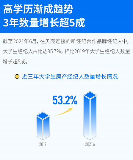 就在网友们激烈讨论“大学毕业可不可以去当房产中介”的同时,贝壳研究院聚焦大学生的就业选择,在通过收集13万余份大学生房产经纪人调研数据的基础上,发布《2021大学生房产经纪人职业调研报告》。报告从房产经纪人的职业现状、人才画像、职业发展等多个维度深度挖掘当下大学生房产经纪人的发展现状。报告中尤其指出,目前高学历经纪人已经逐渐成为房产经纪行业趋势,越来越多的大学生主动愿意选择成为一名房产经纪人。