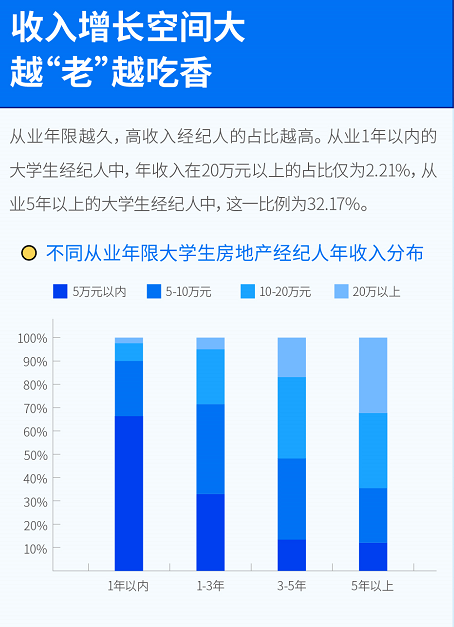 2021年是蒋美林成为房产经纪人的第二年。虽然时间不长,她已经积累了一批信任她的客源。对于房产经纪而言,客源也意味着更大的增长空间。就像《2021大学生房产经纪人职业调研报告》中数据展示的那样,从业五年以上积累更多客源的大学生经纪人年收入20万以上的达到32.17%,远超从业一年的大学生经纪人比例。明晰且具有潜力的未来发展空间,成为了吸引更多大学毕业生选择成为房产经纪人的重要因素之一。